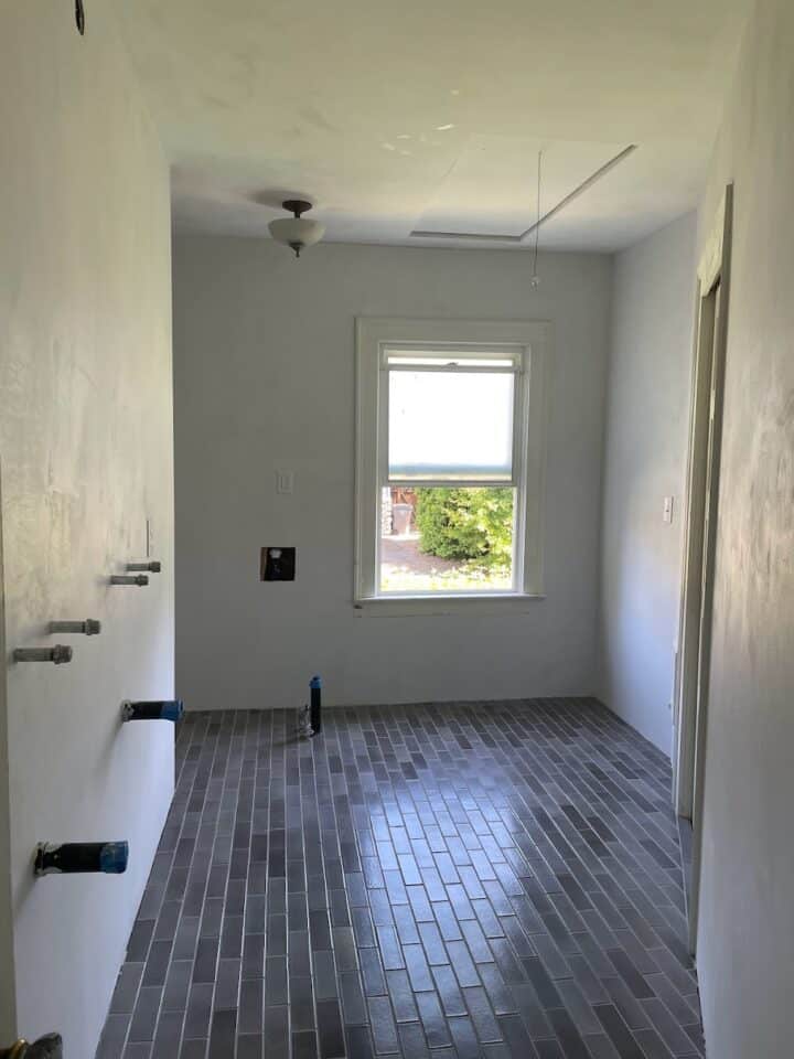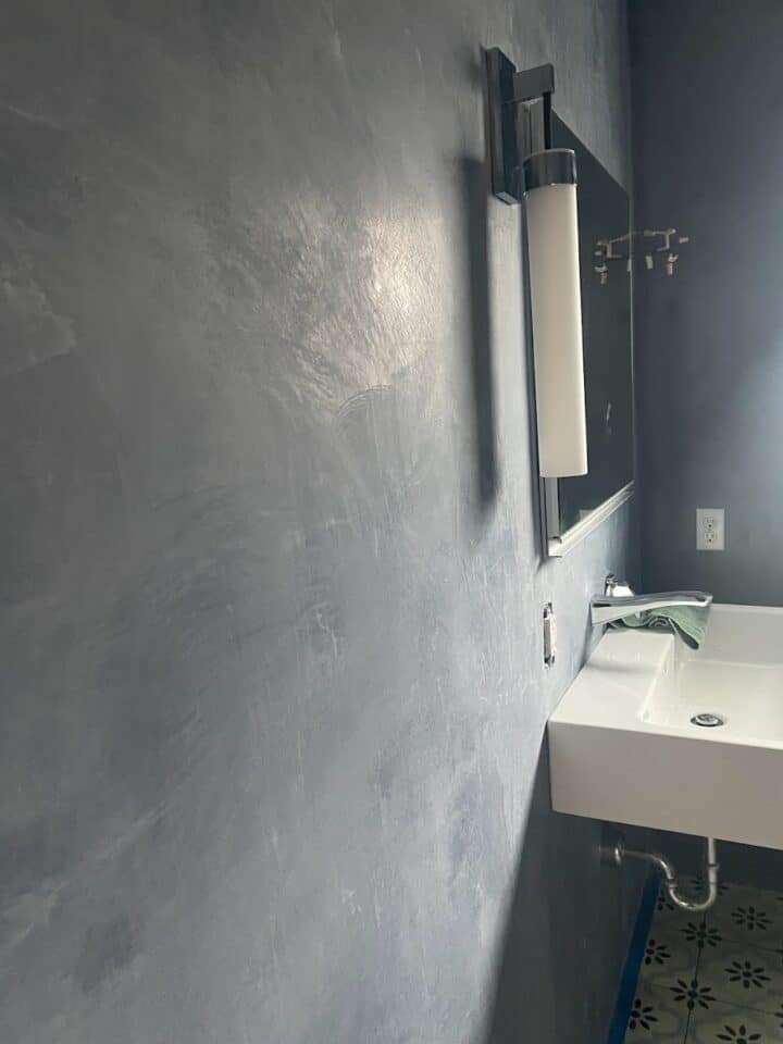 Tadelakt is a thin veneer finish. For wet-use areas we always use cement board behind our tadelakt. In addition to the thickness of the cement board, all of our layers of Tadelakt add about to ⅜”-½” thickness. (thinner than most tiles) The waterproofing measures technically happen before the actual tadelakt is applied. So, the water proofness is only effective if each step of the process has been done correctly. RUDYCO artisans prefer to do all our own prep work including installing cement board to studs and applying water-proofing membrane – in order to ensure it has been done correctly. When each step has been applied correctly and you maintain your Tadelakt surface per our instructions, Tadelakt can last the lifetime of your home.